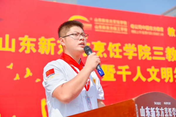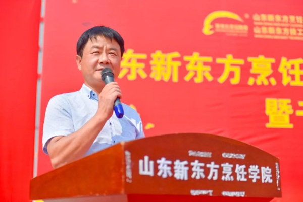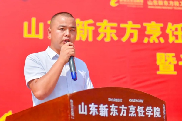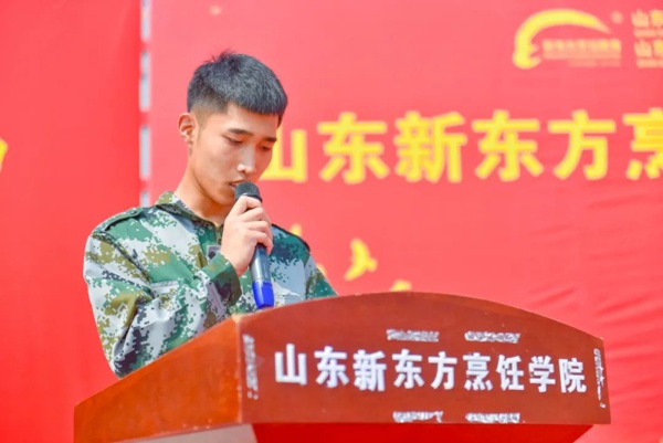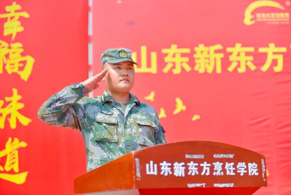 山东新东方烹饪学院院长助理郭助上台作重要讲话;军训是一场仪式,亦是一项必须落实的课程。军人百折不挠,勇往直前的精神,应当被我们继承,在我们的专业领域,将其发扬光大。希望同学们在未来几天的军训中,严格遵守教官规定,认真贯彻每一项任务,以饱满的姿态,去演绎青春的风采!