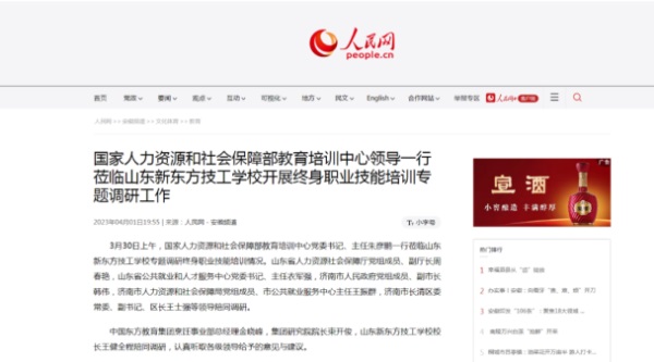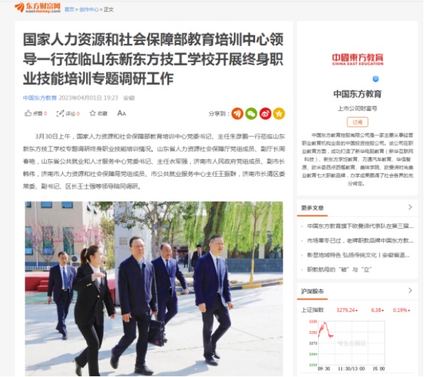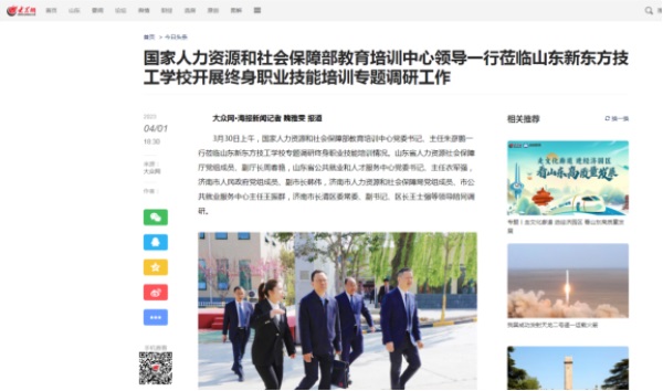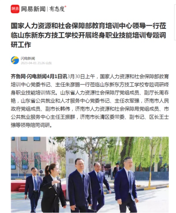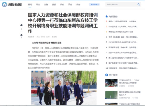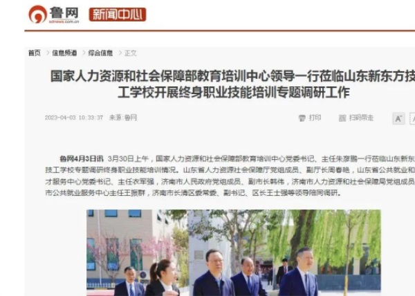 2023年3月30日,国家人力资源和社会保障部教育培训中心领导一行莅临山东新东方技工学校开展终身职业技能培训专题调研工作。本次专题调研工作引起各大媒体的关注,人民网、齐鲁晚报,海报新闻,大众网,闪电新闻,齐鲁网,网易新闻,腾讯等多家媒体纷纷报道。