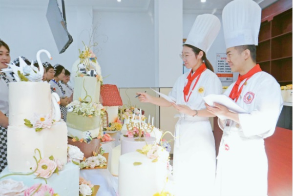 在规定时间内,学生们运用阶段所学知识技能,精心地设计制作属于自己的艺术蛋糕,呈现在考评老师面前。考评老师们对学子们制作出来的作品的形状、色泽、操作卫生等逐一进行打分。对同学们的表现,评委老师给予了高度评价,并指出在考核中的不足,鼓励同学们在接下来的学习中继续加强。