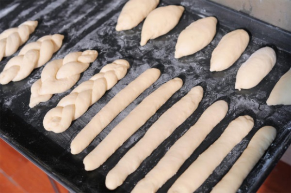 中间醒发,其实这个时间很短,大约十分钟。这个过程并不是要等面团发酵,而是让分割滚圆后的面团恢复柔软和弹性,便于接下来的整形,一定要在面团开始失去弹性之前,对其进行充分醒发。注意松弛时可以放在室温,但要覆盖湿毛巾防止小面团变干表面结皮。成型也叫整形,就是把经过醒发好的面团做成需要的形状。注意:滚动成型时,要将面团向两侧拉伸。