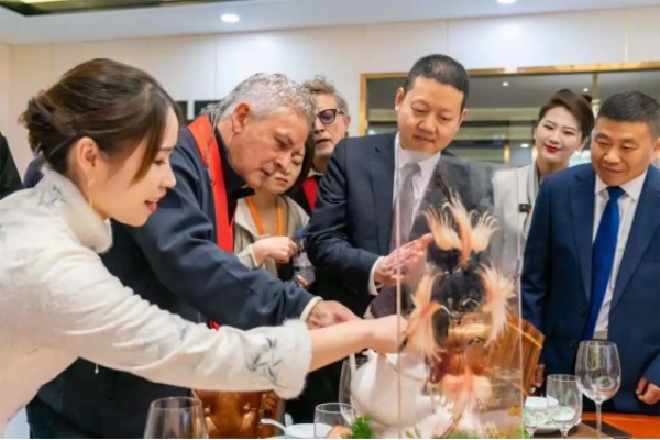中式宴席是中国传统聚餐的一种形式,为了欢迎国际友人,新东方烹饪学校的师生们做了一桌“世界的美食、中国的新东方”主题宴席。烹饪可以消解文化代沟,更能展现大国胸怀。一道用手托起的地球,引起了世界球星们的赞叹,新东方烹饪学校的师生们用自己独有的技艺肩负着传播中国烹饪文化的使命。