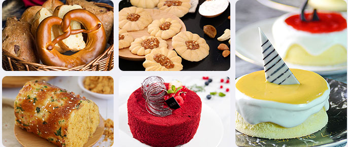 生日蛋糕胚、妙芙蛋糕、哈雷蛋糕、曲奇饼干、核桃酥、脆皮泡芙、桃李面包、牛角包、丹麦面包、